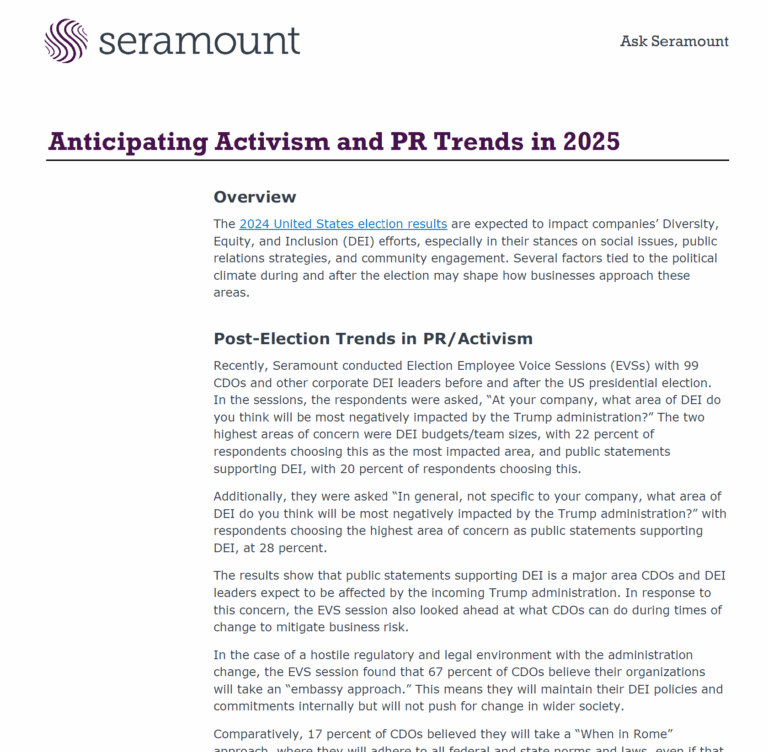 This report analyzes how the 2024 U.S. election and the second Trump administration are reshaping corporate approaches to DEI, activism, and public relations. Seramount’s post-election listening sessions found that Chief Diversity Officers expect public statements supporting inclusion to face the most negative impact, with 67% of organizations adopting an “embassy approach” — maintaining DEI internally but avoiding public advocacy. The growing DEI backlash has led some companies, like Zoom and Twitter/X, to reduce transparency or dissolve DEI teams. However, Seramount’s 2024 employee survey shows that over half of U.S. employees still believe it’s very important for companies to publicly support issues impacting workers and communities. The report emphasizes that consistency, transparency, and alignment with company values remain essential for maintaining employee trust and credibility in 2025.