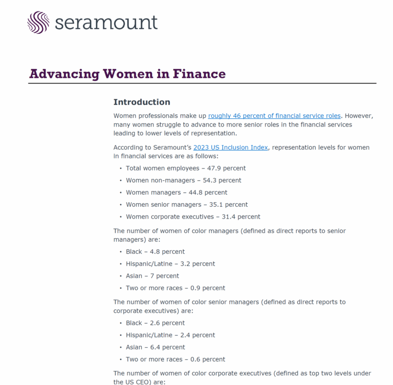 This report examines women’s representation across financial services and the barriers that limit their advancement—particularly for women of color. While women make up nearly half of the financial services workforce, their representation drops sharply at senior levels, with only 31% in executive roles and far fewer among women of color. The report highlights organizational strategies that are helping close these gaps, including leadership programs, sponsorship initiatives, and visibility campaigns. Case studies from Capital Group, Centene, Chubb, Frazier & Deeter, Mazars, and StepStone show how targeted development, mentorship, and inclusive culture-building are driving measurable progress. Use this resource to identify actionable ways to support women’s advancement and strengthen gender equity across the financial sector.