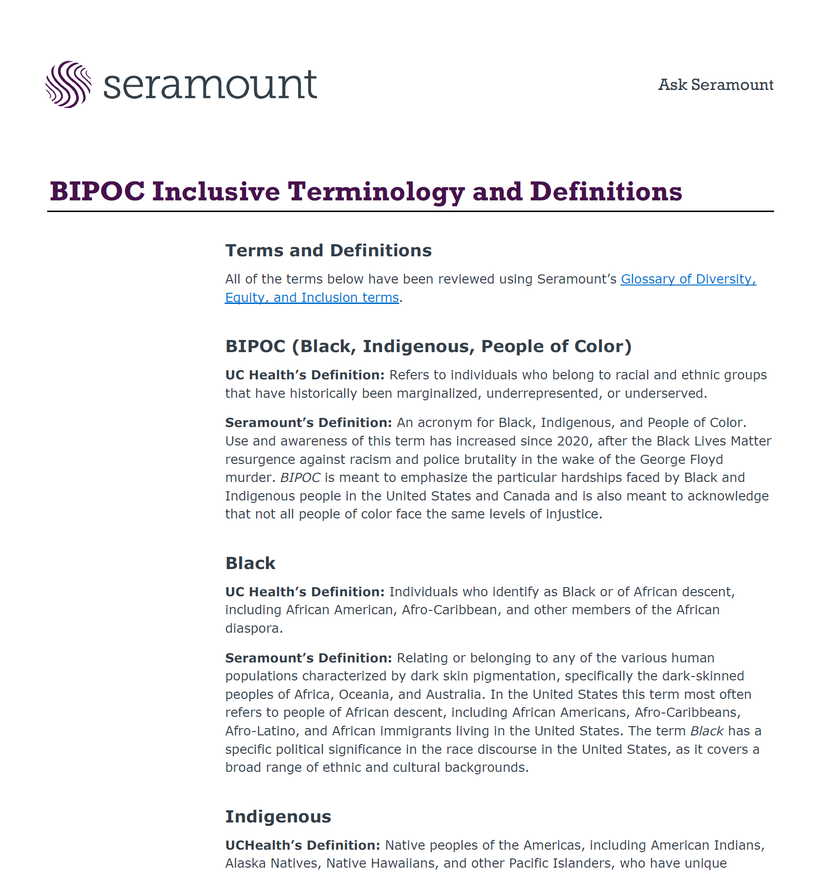 This document provides standardized definitions for key identity terms—BIPOC, Black, Indigenous, People of Color, and MENA—to promote accurate and inclusive language in the workplace. Drawing on Seramount’s DEI Glossary and UC Health’s definitions, it clarifies that BIPOC highlights the specific inequities faced by Black and Indigenous communities while acknowledging the varied experiences of all people of color. It also defines Black as encompassing people of African descent globally, Indigenous as descendants of original inhabitants maintaining distinct social and cultural systems, People of Color as a unifying but complex term for racially marginalized groups, and MENA as referring to populations from the Middle East and North Africa. The guide underscores the importance of specificity and respect when using identity-related terminology.