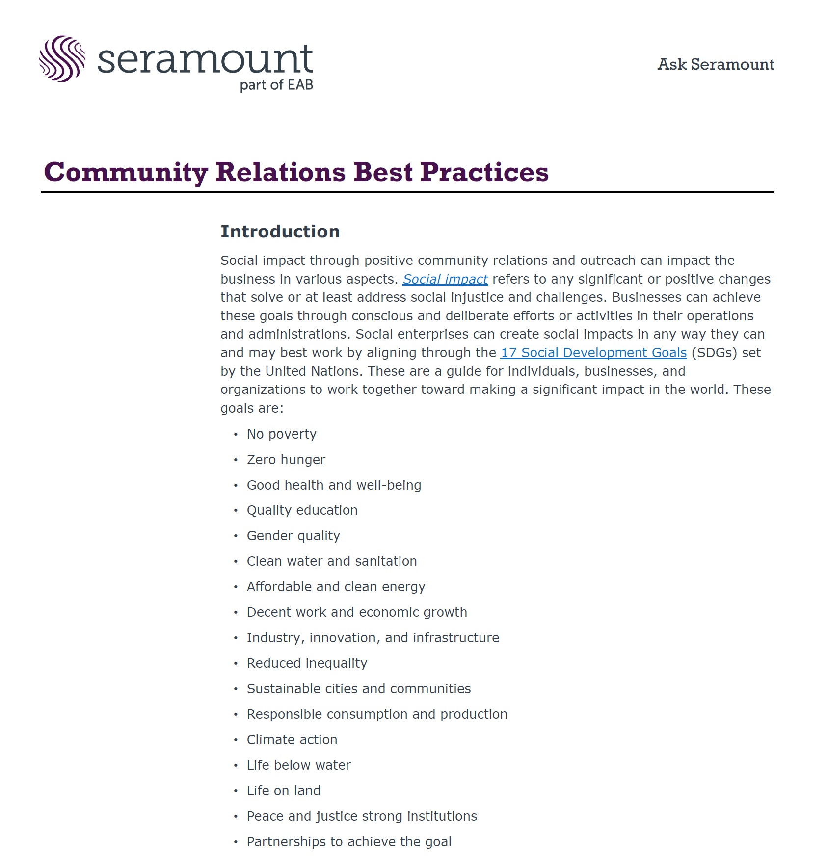 This report outlines strategies for companies to strengthen community relations and create meaningful social impact. It highlights alignment with the UN’s 17 Sustainable Development Goals (SDGs) and recommends four main approaches: advancing CSR/ESG initiatives, engaging in corporate philanthropy, supporting local business growth, and encouraging entrepreneurship. Seramount’s 2022 Inclusion Index data shows that 60% of companies participated in community initiatives, with most DEI nonprofit funding directed toward organizations serving women (24%) and Black communities (25%), underscoring the growing link between corporate purpose and community engagement.