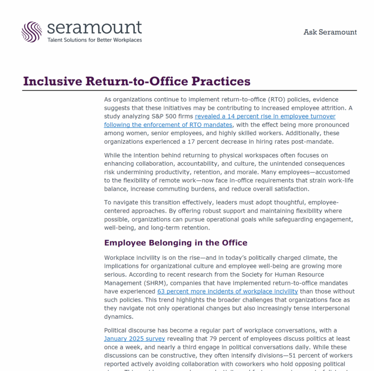 This report outlines how to make return-to-office (RTO) policies more employee-centered and sustainable. It shares research showing rigid mandates increase turnover—especially among women and senior staff—and offers strategies to support belonging, psychological safety, and hybrid equity. Guidance includes preparing inclusive workspaces, training managers to navigate tension and politics, and using engagement activities to rebuild trust and connection.
