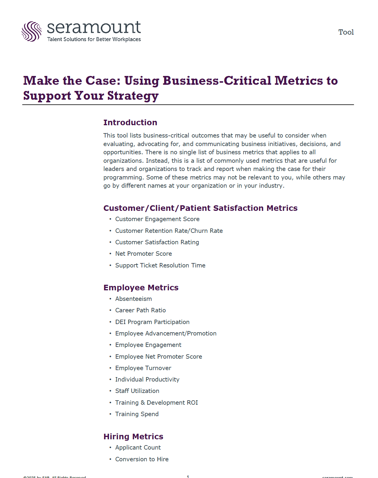 This tool lists business-critical outcomes that may be useful to consider when evaluating, advocating for, and communicating business initiatives, decisions, and opportunities. There is no single list of business metrics that applies to all organizations. Instead, this is a list of commonly used metrics that are useful for leaders and organizations to track and report when making the case for their programming.