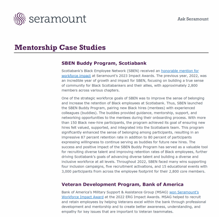 This report showcases successful mentorship and development initiatives across major companies recognized by Seramount. Scotiabank’s SBEN Buddy Program improved belonging and retention among Black employees, achieving an 87% retention rate. Bank of America’s Military Support & Assistance Group (MSAG) and HOLA networks advanced professional growth through structured mentorship, with programs like the Veteran Development Program and BRIDGE Experience driving career mobility and engagement. T-Mobile’s mentorship platform, Chronus, connected employees across locations post-merger, resulting in 78% retention for participants. Together, these case studies demonstrate how mentorship fosters inclusion, strengthens culture, and accelerates employee advancement across diverse industries.