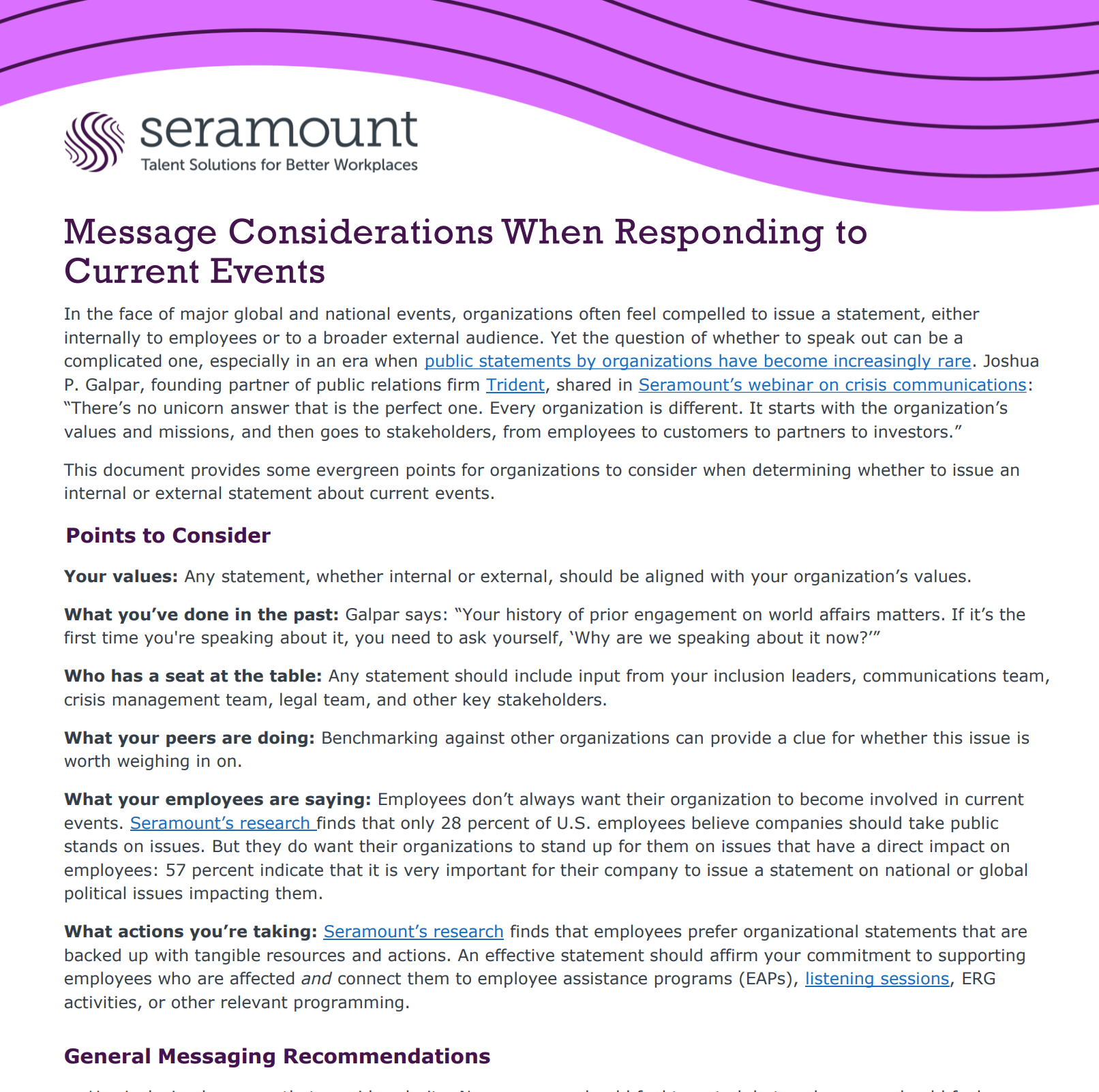 In the face of major global and national events, organizations often feel compelled to issue a statement, either internally to employees or to a broader external audience. Yet the question of whether to speak out can be a complicated one, especially in an era when public statements by organizations have become increasingly rare. This document provides some evergreen points for organizations to consider when determining whether to issue an internal or external statement about current events.