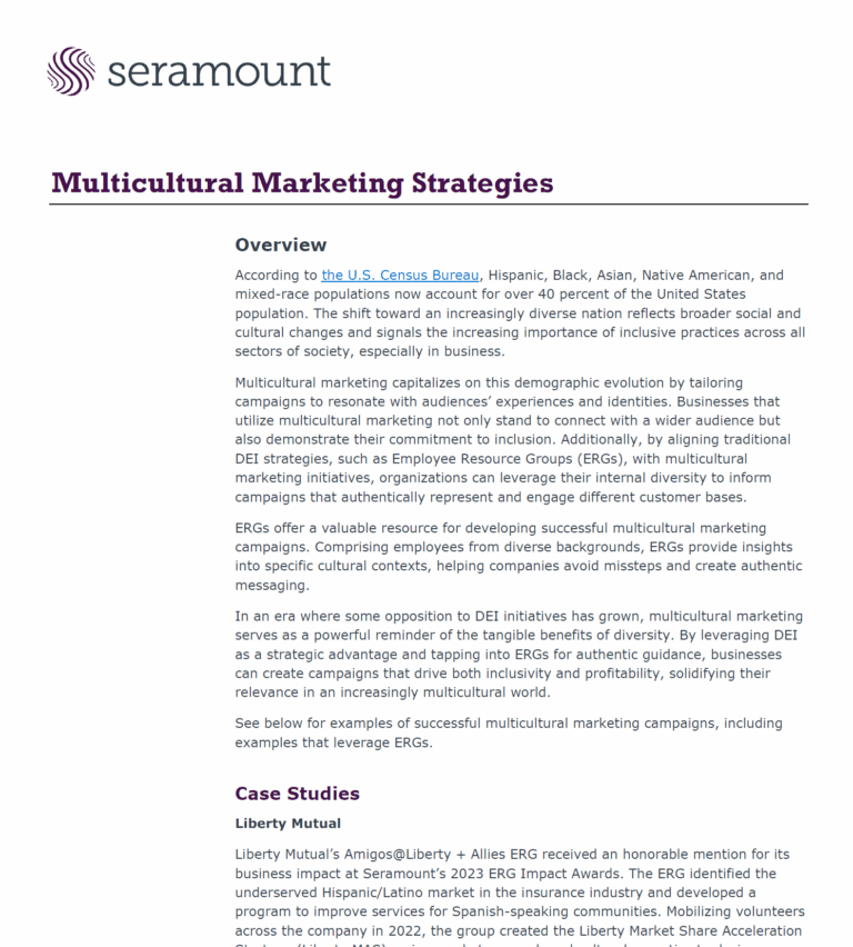 This report explores how companies are using multicultural marketing to authentically engage an increasingly diverse U.S. population—now more than 40% Hispanic, Black, Asian, Native American, and multiracial. It highlights how Employee Resource Groups (ERGs) serve as powerful partners in shaping campaigns that reflect real cultural insight and strengthen brand trust. Case studies from Liberty Mutual, Bank of America, Horizon Blue Cross Blue Shield, Freddie Mac, and State Farm show measurable business results from culturally informed marketing. Use this guide to see how aligning DEI strategy with marketing efforts can expand reach, boost engagement, and drive both inclusion and growth.