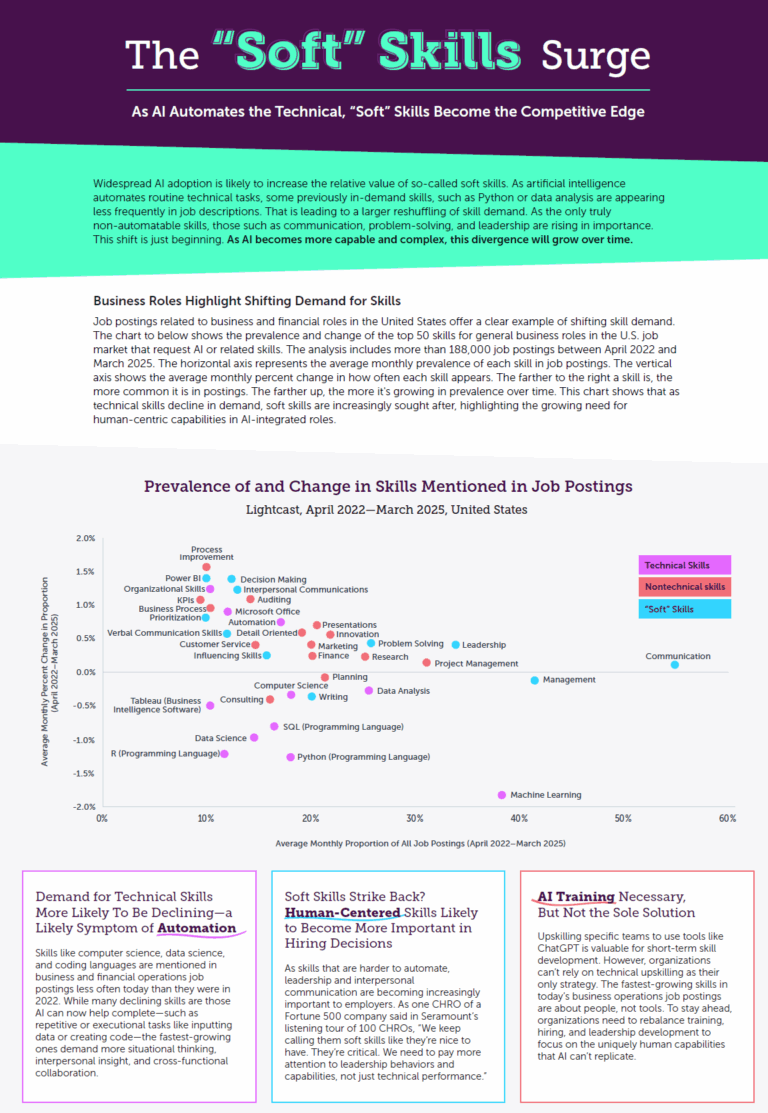 New labor market data reveals a turning point in the world of work. As technology takes on more technical and routine tasks, demand is shifting toward the skills that AI cannot replace: communication, problem-solving, and leadership.